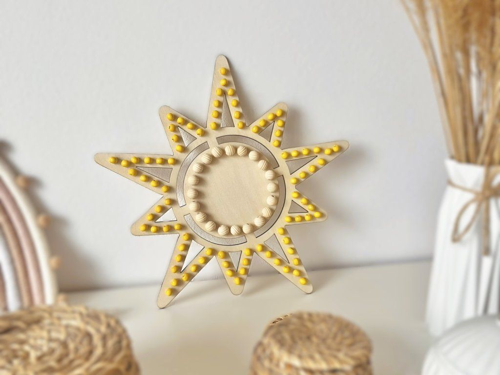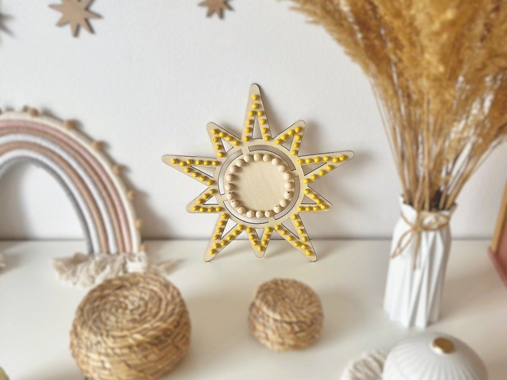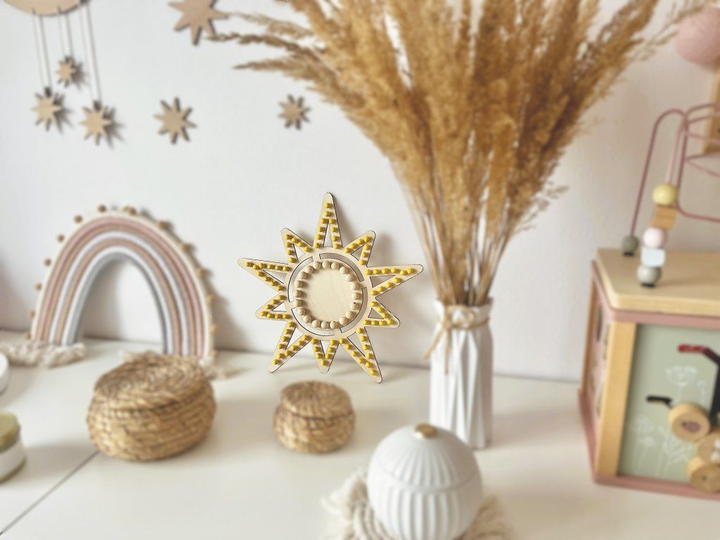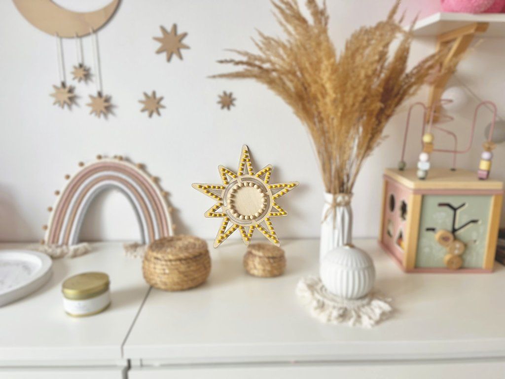 Dřevěná dekorace sluníčka rozzáří dětský pokoj i v těch nejvíce zamračených dnech.