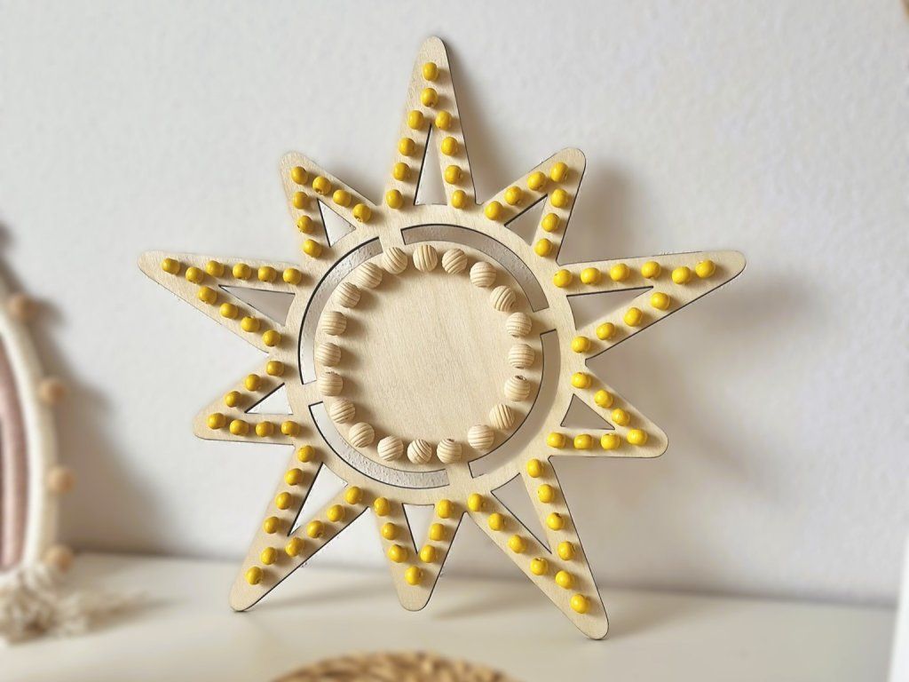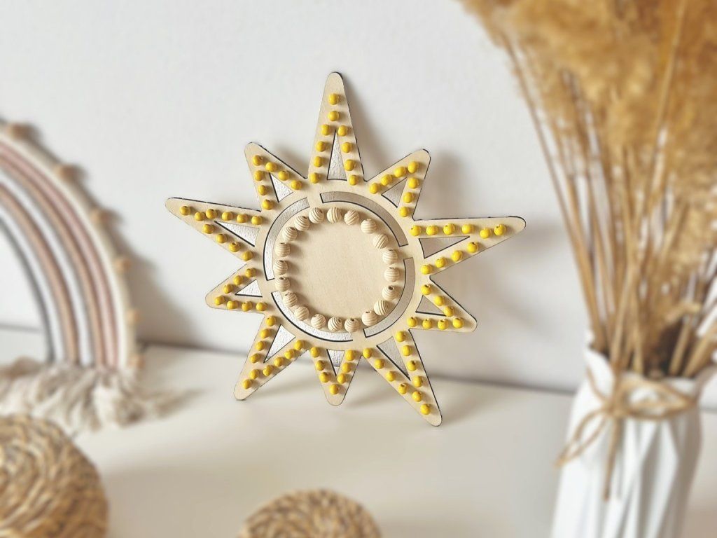 Originální dřevěná dekorace sluníčka je vyrobena z kvalitní březové překližky a doplněna dřevěnými korálky. Neokoukaný design, přírodní materiál a jemné tóny - to nejvíce charakterizuje tento minimalistický doplněk, který zaujme na první pohled.